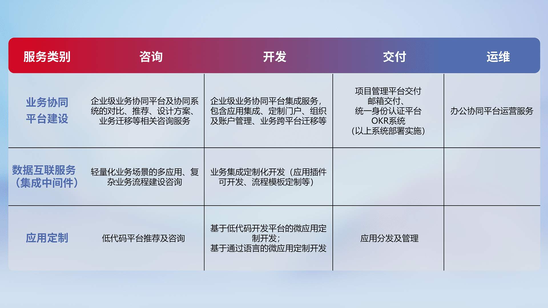 针对钉钉、、企微、、、、IDaas等平台级产品提供产品的规划、、方案、、交付、、定制化开发等服务,,,实现如统一协同办公、、智能客户服务、、混合会议管理、、智能数据查询、、等业务场景,,,实现数字化转型。。