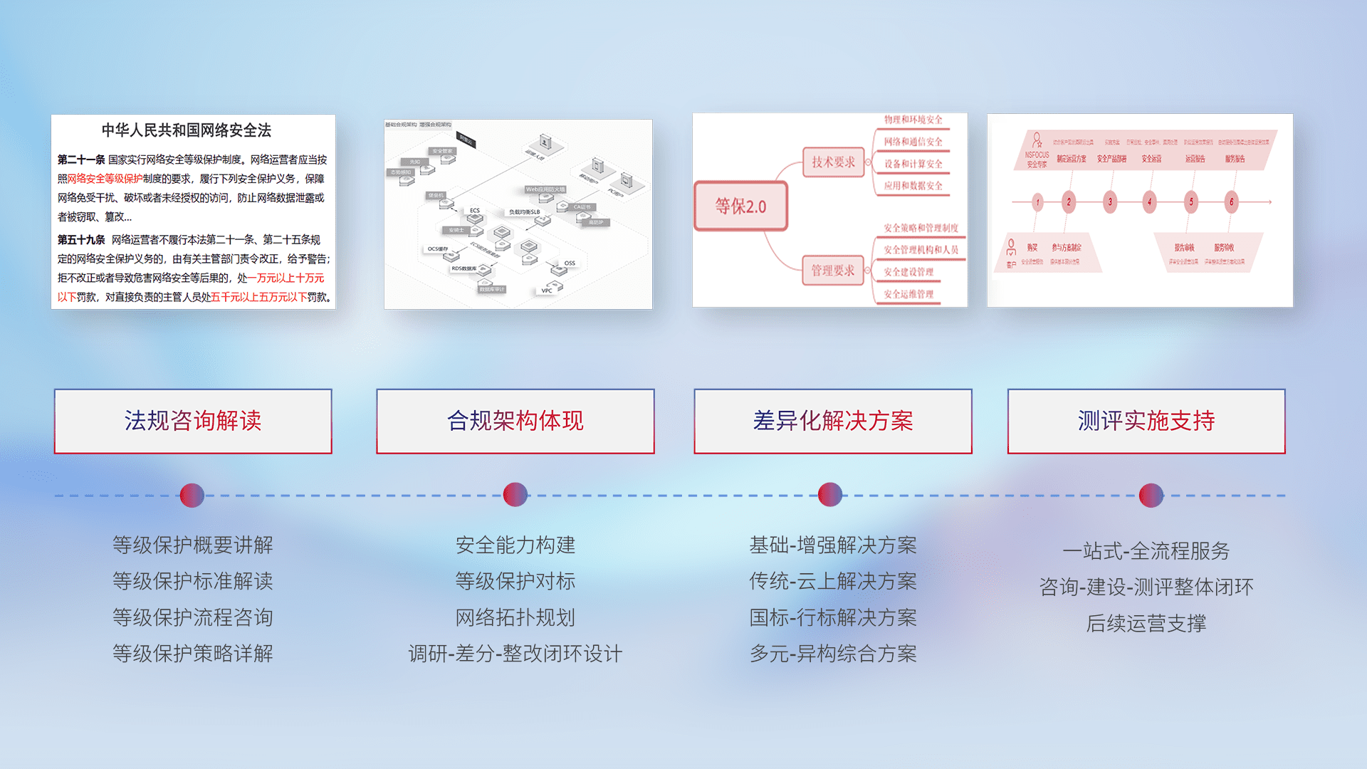 通过专业的法律咨询解读、、、、合规架构体现、、、、差异化解决方案、、测试实施支持等服务,,,,为客户量身打造等保合规体系。。